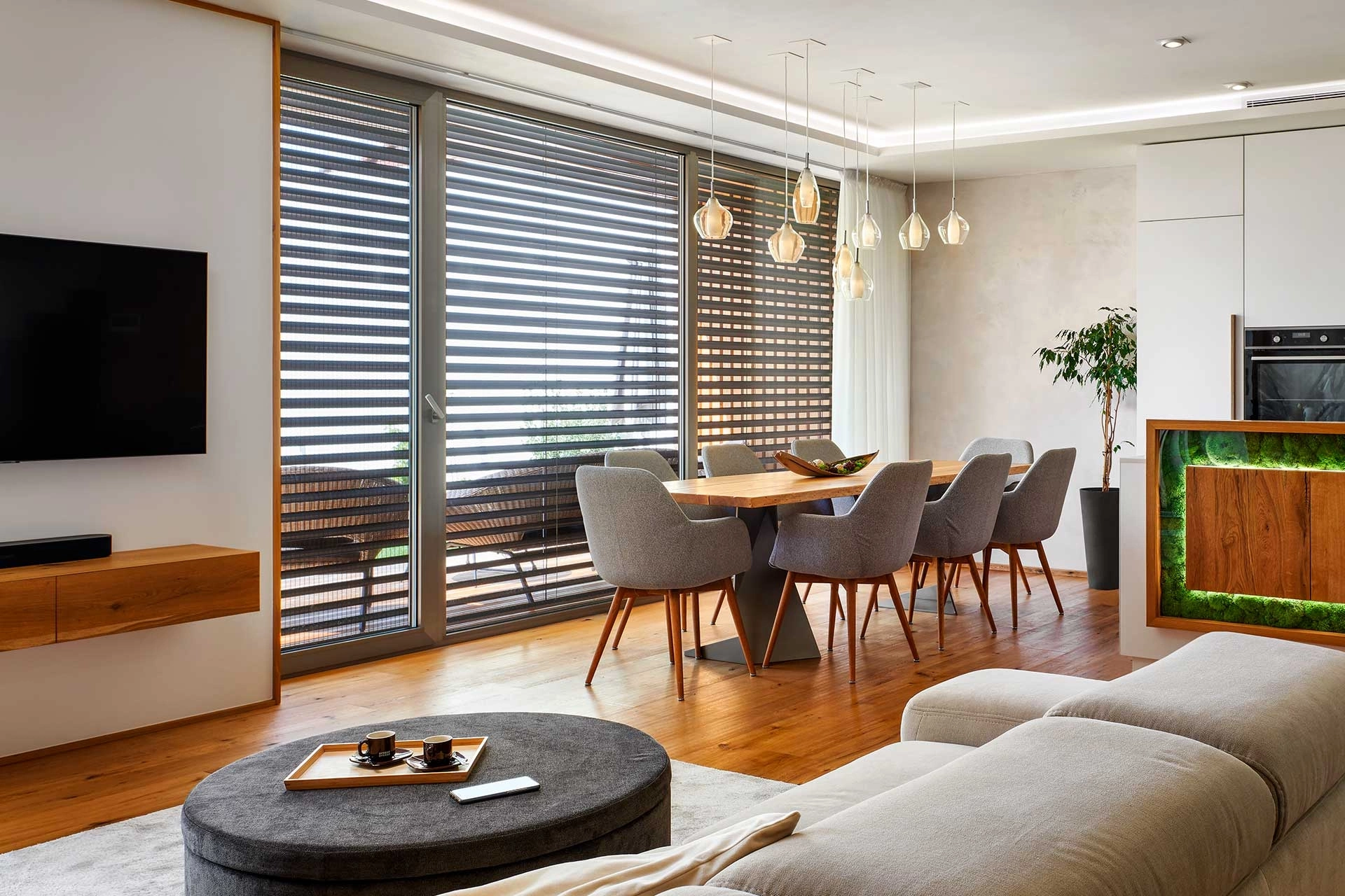 Dacă încă te afli în faza de proiect, îți recomandăm să consulți un arhitect în ceea ce privește dezvoltarea unei vizualizări. Unii, sunt deranjați de aspectul dominant al jaluzelelor de pe clădire, așa că se ​hotărăsc pentru utilizarea plasei de protecție solară exterioară cu un design curat. Umbrirea exterioară poate fi combinată - în funcție de orientare cardinală sau de funcția camerei.